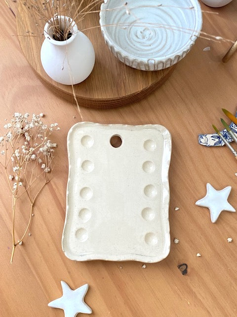 The beauty of the ceramic palette is in the small imperfections that you see which shows the marks of the maker. No two palettes are same even if it's the same design because these aren't mass produced. They are made in small batches by me. You can use them for any medium. Even cake decorating! I hope you enjoy using them as much as I did in making them and using them.