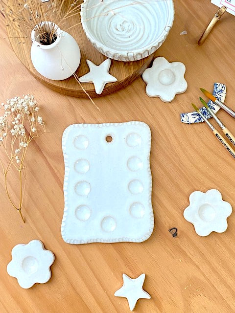 I designed this palette to mimic a frame with beautiful carved detailing all around it. I love how the clay peeks through the glaze in some areas to give it more character. The color of the glaze is almost toasty white so you can see the true colors of the paint easily. There's also a hole on the top so you can hang it on a hook or nail in the wall to waste less space on storage. It's big enough to mix and have multiple colors and small enough to be carried in a variety of carry on pouches and bags for travel or plein air painting.