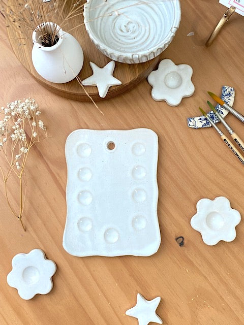 I designed this palette to mimic a frame . I love how the clay peeks through the glaze in some areas to give it more character. The color of the glaze is almost toasty white so you can see the true colors of the paint easily. There's also a hole on the top so you can hang it on a hook or nail in the wall to waste less space on storage. It's big enough to mix and have multiple colors and small enough to be carried in a variety of carry on pouches and bags for travel or plein air painting.