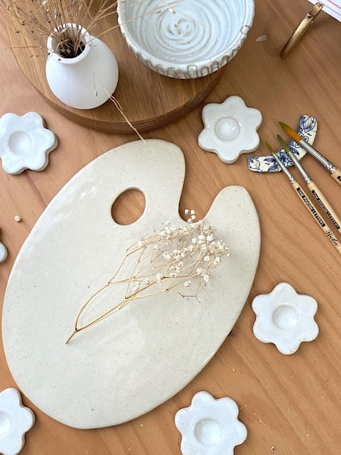The palettes are made with stoneware clay and fired to Cone 6. Wash them with water and they'll become stain free ( if you use water based paints or mediums). Hand washing will prolong the life of your Ceramics so I highly recommend that. Even though it's dishwasher safe, I don't recommend it because I don't want your food utensils and dinnerware to be contaminated with even a little trace of paint.