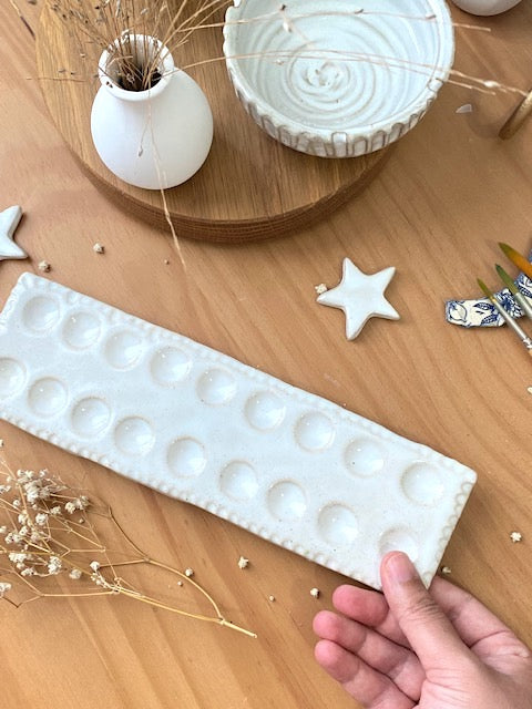 I made this palette for the artists who like to have a lot of color options on hand and don't care much about mixing. This palette has 18 Wells! Carving around the edge has been my new favorite technique now so I gave it the same carved border. My husband named this palette "the bar" when I was having difficult time coming up with a name for this. I love how the clay peeks through the glaze in some areas to give it more character. The color of the glaze is almost toasty white so you can see the true colors of the paint easily.